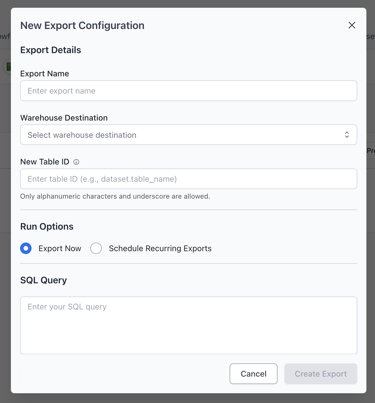 Create Export - Once saved, the export will either run immediately or on its configured schedule and append new rows to the destination table.