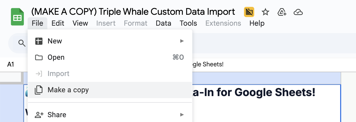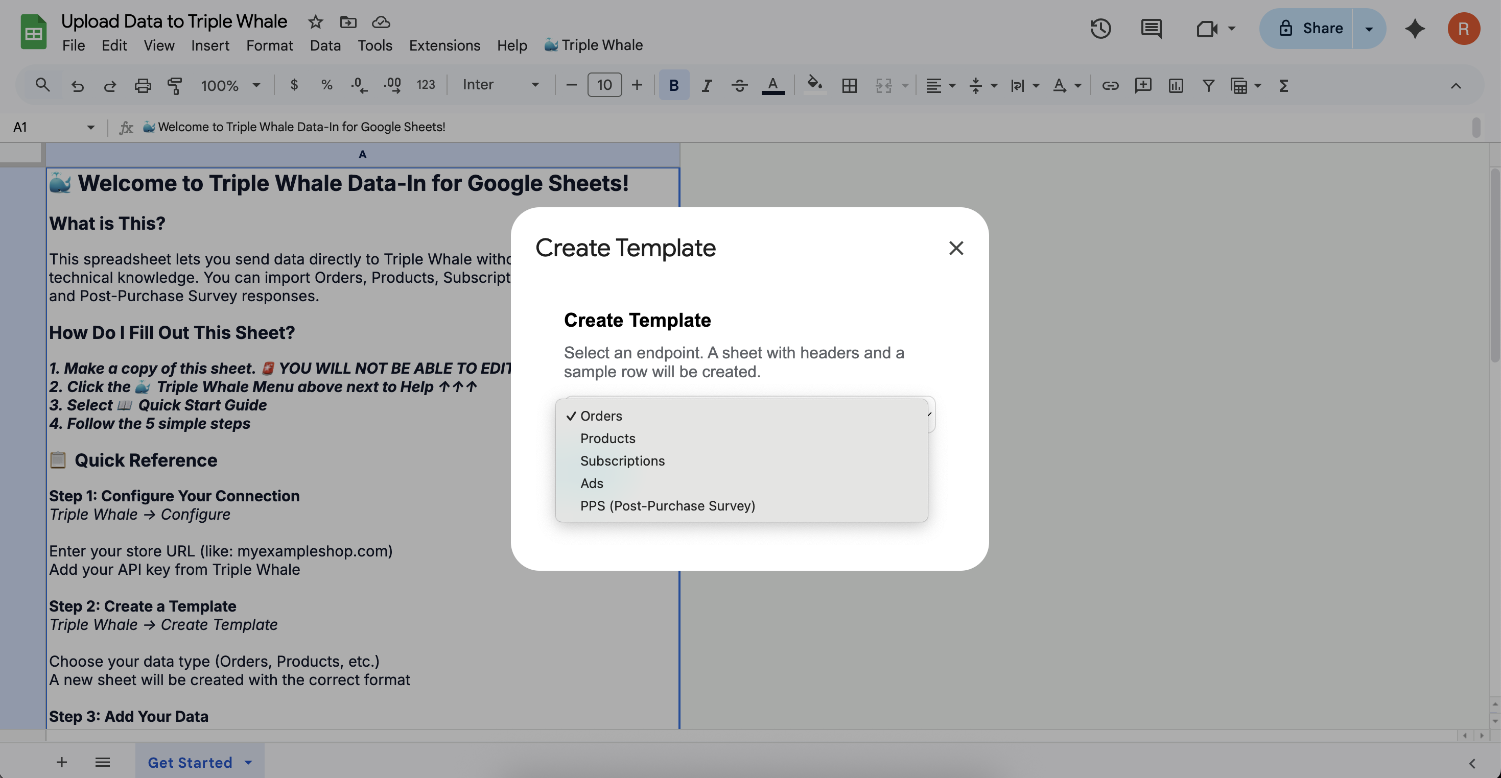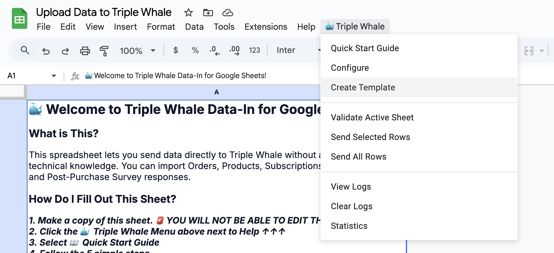 In the Google Sheet menu, click Triple Whale → Create Template.