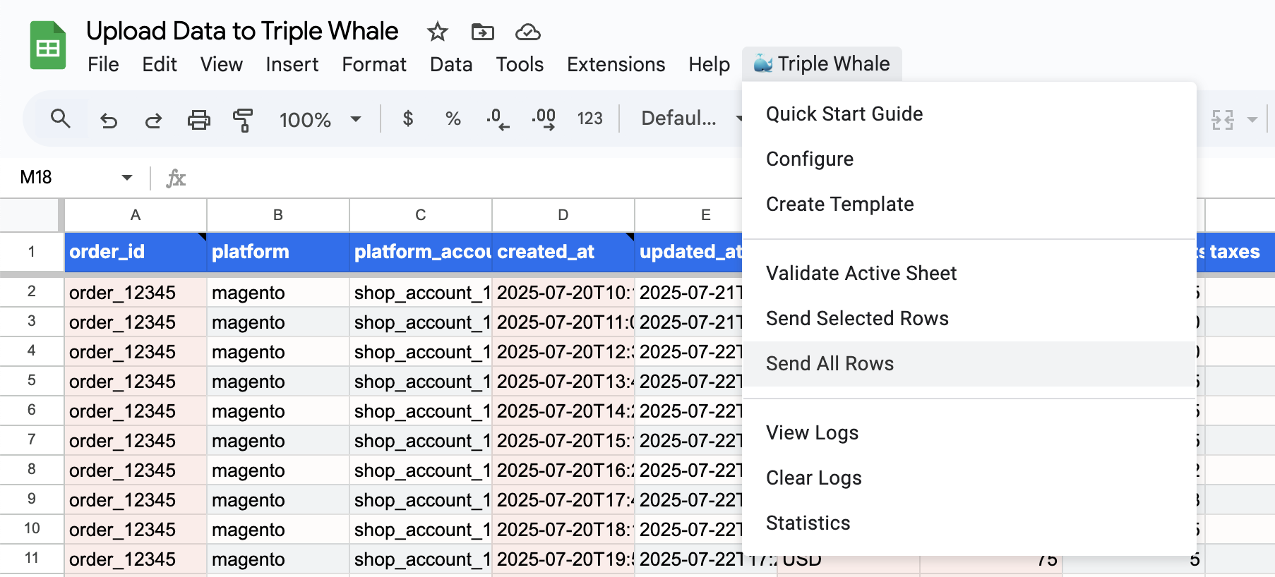 Once your data is ready and validated, click Triple Whale → Send All Rows (or Send Selected Rows to send a subset).