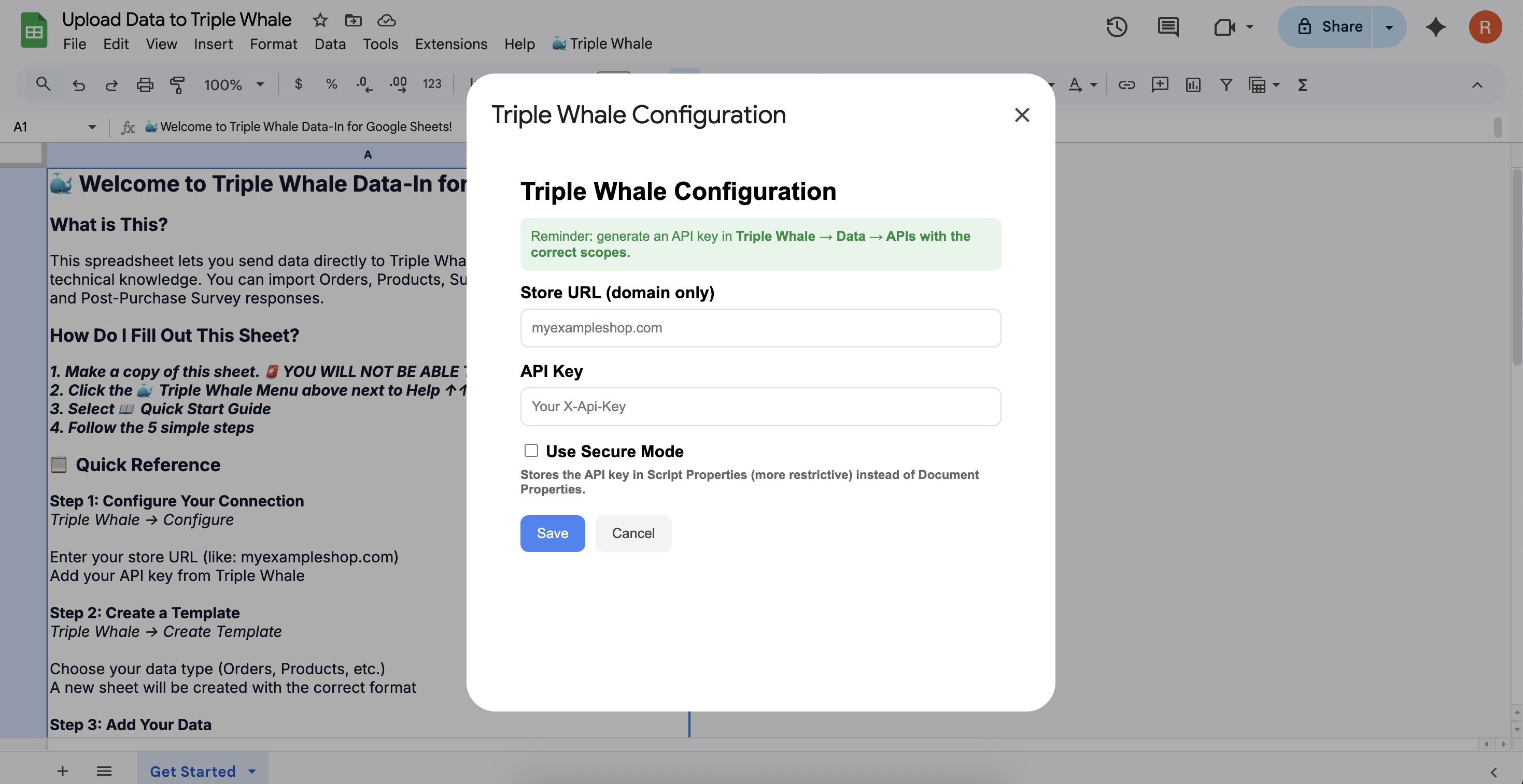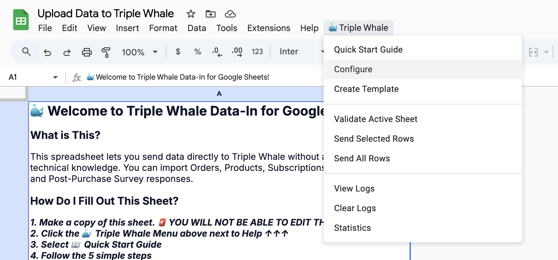 In the menu bar, click Triple Whale → Configure. (First time only: Click OK to authorize the script to run, sign in to your Google account, and grant the requested permissions.)