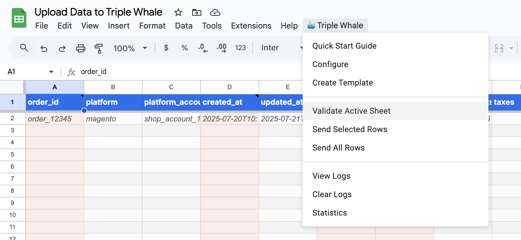 In the menu bar, click Triple Whale → Validate Active Sheet to check for missing or incorrectly formatted fields. Validation results will appear instantly, so you can fix any issues before sending data.