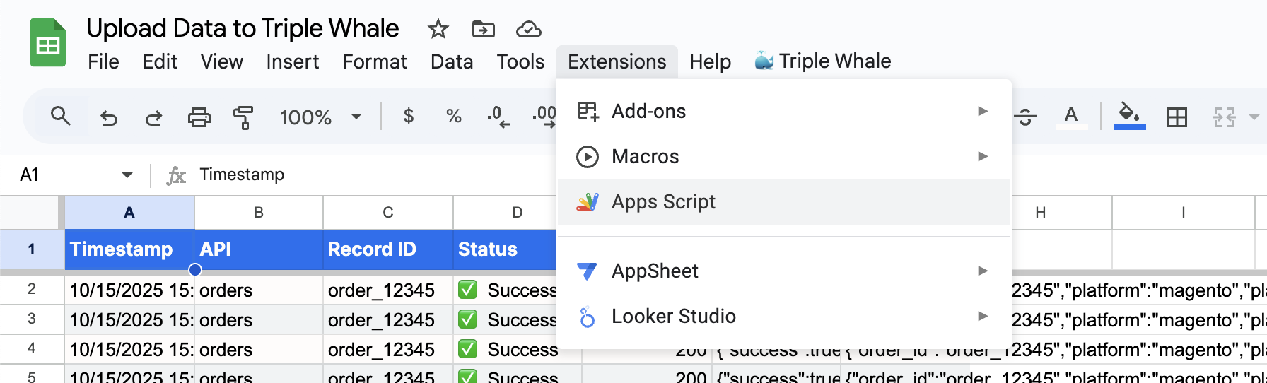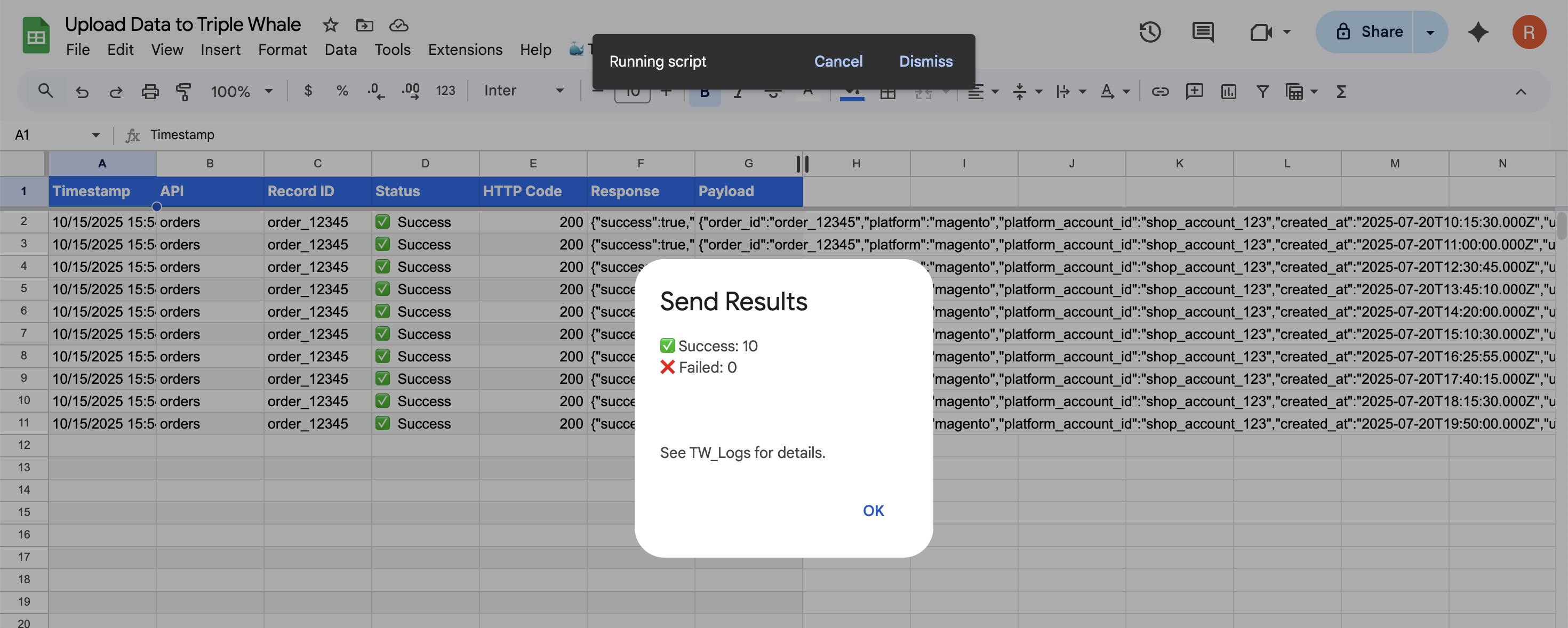 The script will process your rows and send them to Triple Whale’s API. Open the