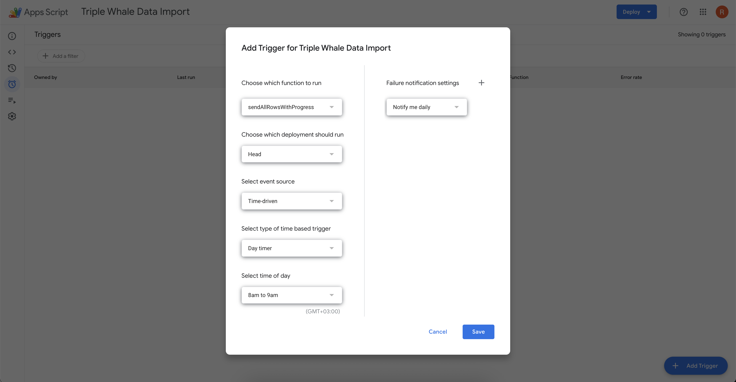 You can set your Google Sheet to automatically run uploads to Triple Whale on a schedule using Google Apps Script triggers.