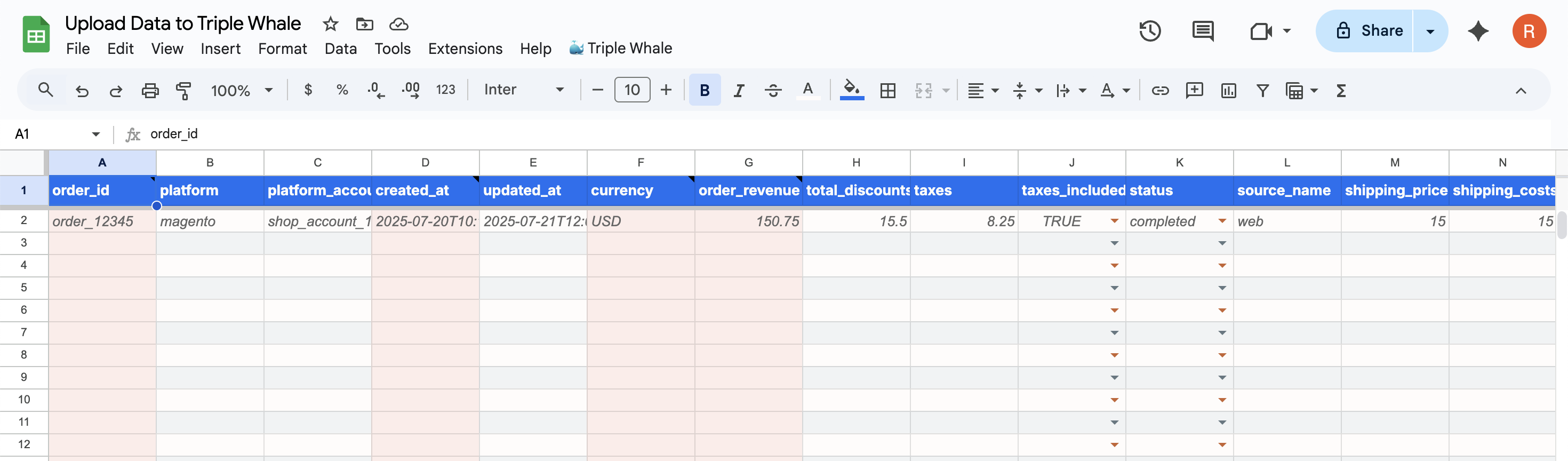 This guide explains how to use the Triple Whale Data-In for Google Sheets template to upload data from any source — including Orders, Products, Subscriptions, Ads, and Post-Purchase Survey data — directly to Triple Whale without writing any code.